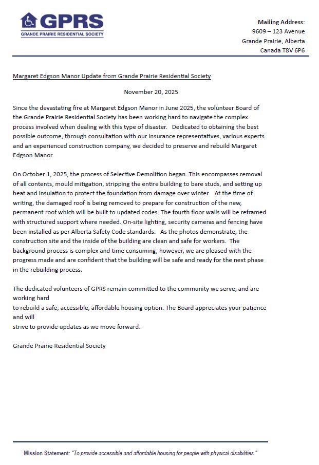 Since the devastating fire at Margaret Edgson Manor in June 2025, the volunteer Board of the Grande Prairie Residential Society has been working hard to navigate the complex process involved when dealing with this type of disaster. Dedicated to obtaining the best possible outcome, through consultation with our insurance representatives, various experts and an experienced construction company, we decided to preserve and rebuild Margaret Edgson Manor.